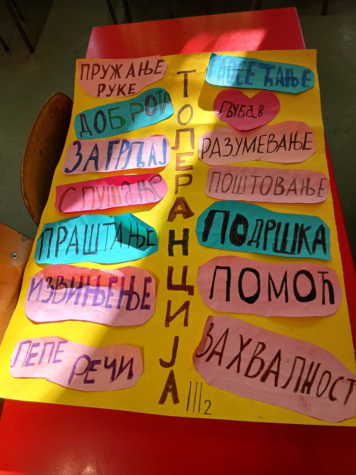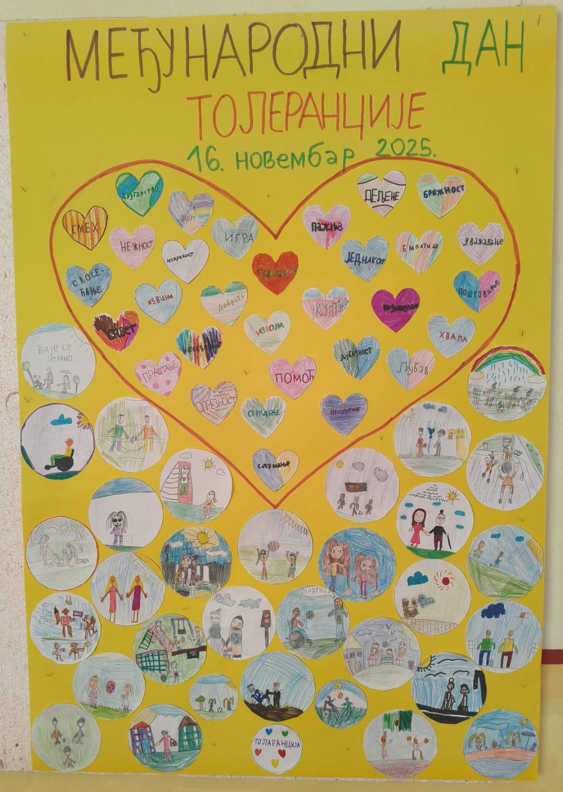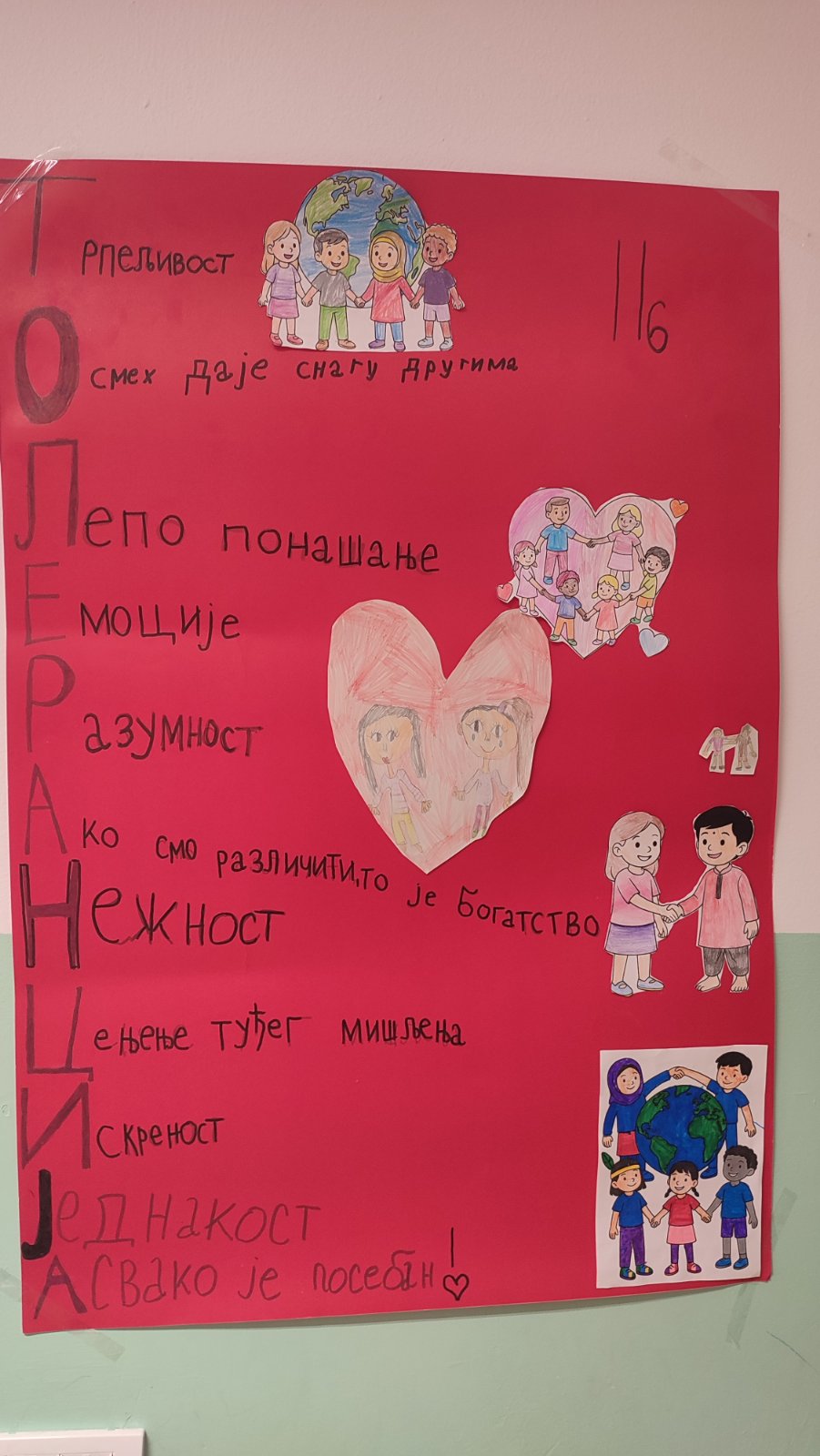 Ученици су обележили Дан толеранције кроз занимљиве и едукативне радионице које су имале за циљ да развију разумевање, поштовање и прихватање различитости. Кроз вођене активности, ученици су разговарали о томе шта за њих значи бити толерантан, како можемо да покажемо доброту у свакодневним ситуацијама и зашто је важно да пажљиво слушамо једни друге. Деца су кроз игру, групни рад и кратке сценске приказе показала да толеранција није само реч — већ поступак који свако од нас може да примени. У оквиру радионица, ученици су заједно осмислили и припремили креативне плакате на тему толеранције. Писали су поруке пријатељства, цртали симболе мира и украшавали плакате бојама које представљају различитост и слогу. Њихови радови сада красе школски ходник и подсећају све ученике на важност међусобног уважавања.